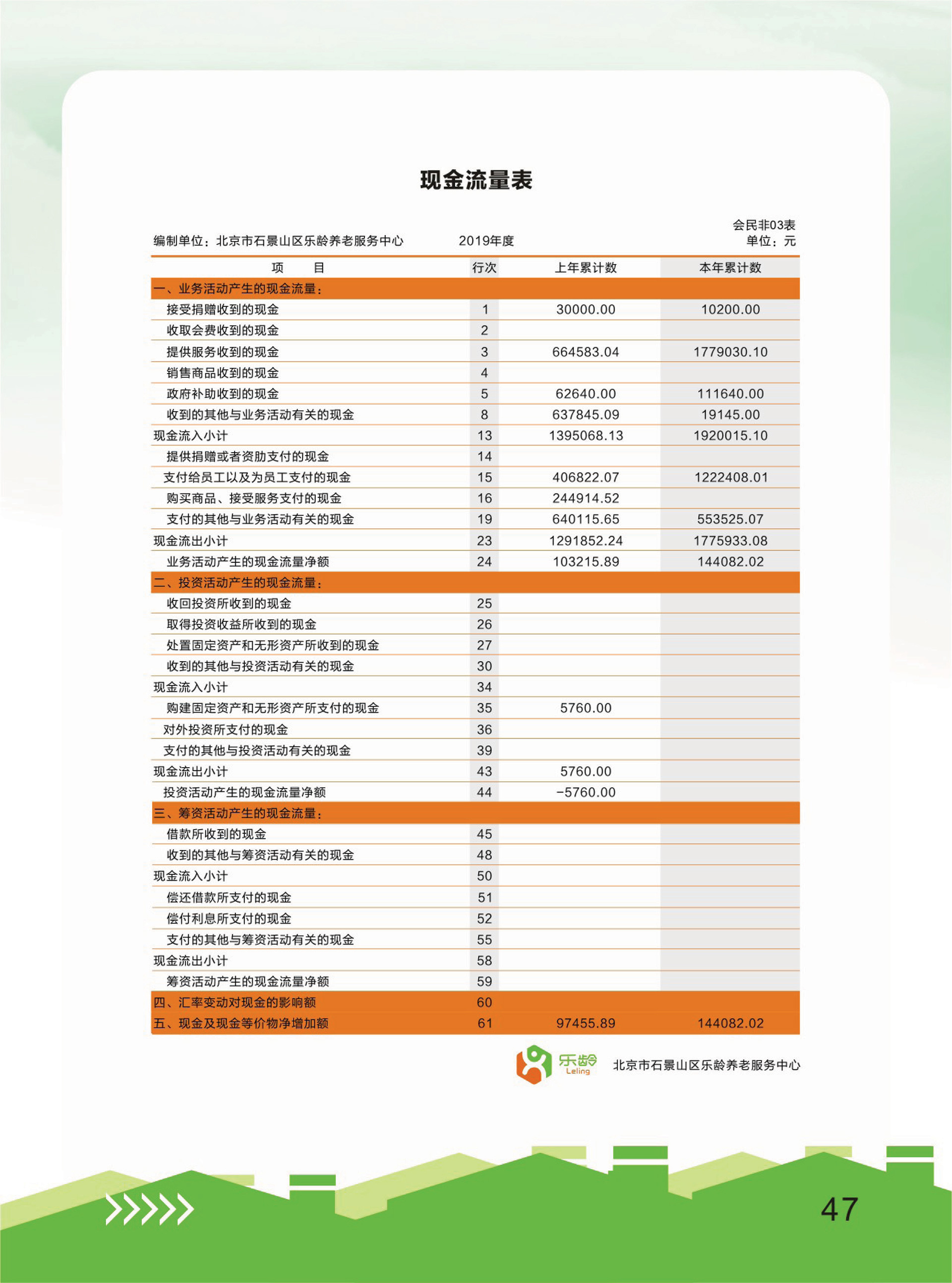 2019年乐龄社区养老现金流量表