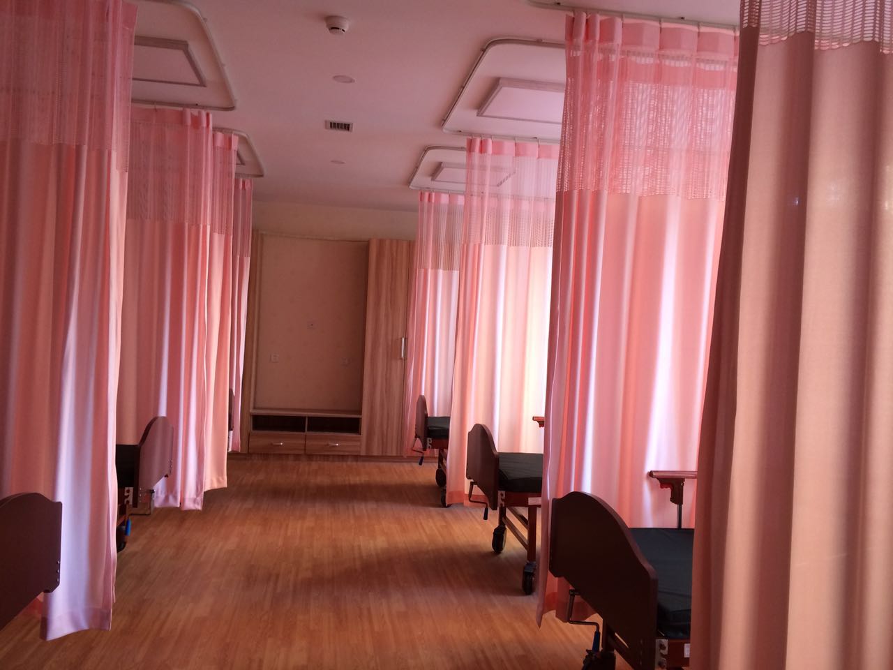 驿站力求为老人提供家庭般的照料环境,站点内部布置温馨、环境舒适,床位间用粉色的纱帘隔开,为老人提供愉悦的居住氛围,同时也保证了床位之间的隐私。