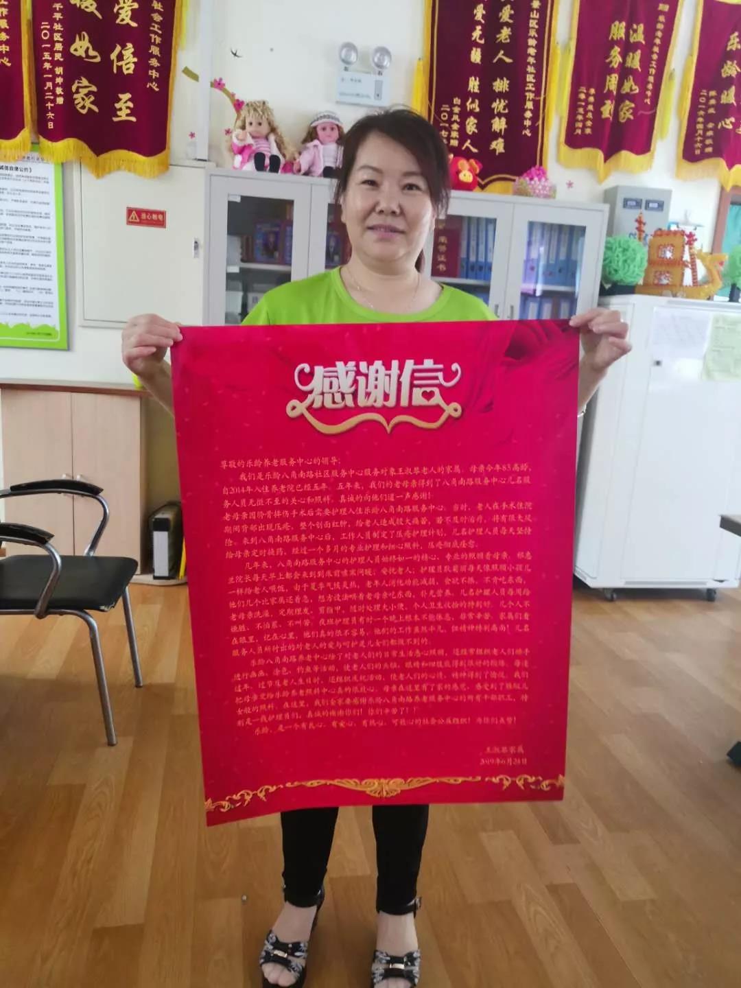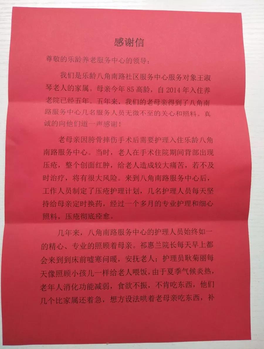 我们是乐龄八角南路社区服务中心服务对象王※琴老人的家属。母亲今年85高龄,自2014年入住养老院已经五年。五年来,我们的老母亲得到了八角南路服务中心几名服务人员无微不至的关心和照料。真诚的向她们道一声感谢!