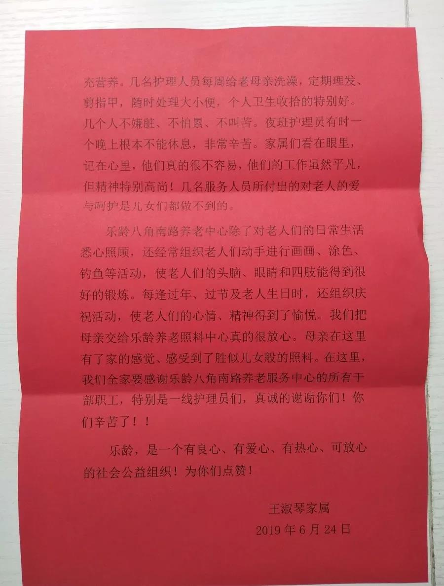 乐龄八角南路养老中心除了对老人们的日常生活悉心照顾,还经常组织老人们动手进行画画、涂色、钓鱼等活动,使老人们的头脑、眼睛和四肢能得到很好的锻炼。每逢过年、过节及老人生日时,还组织庆祝活动,使老人们的心情、精神得到了愉悦。母亲在这里有了家的感觉、感受到了胜似儿女般的照料。在这里,我们全家要感谢乐龄八角南路养老服务中心的所有干部职工,特别是一线护理员们,真诚的谢谢你们!你们辛苦了!!